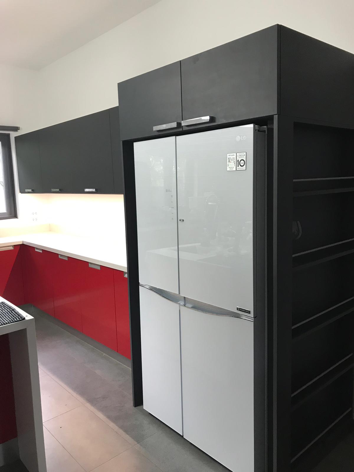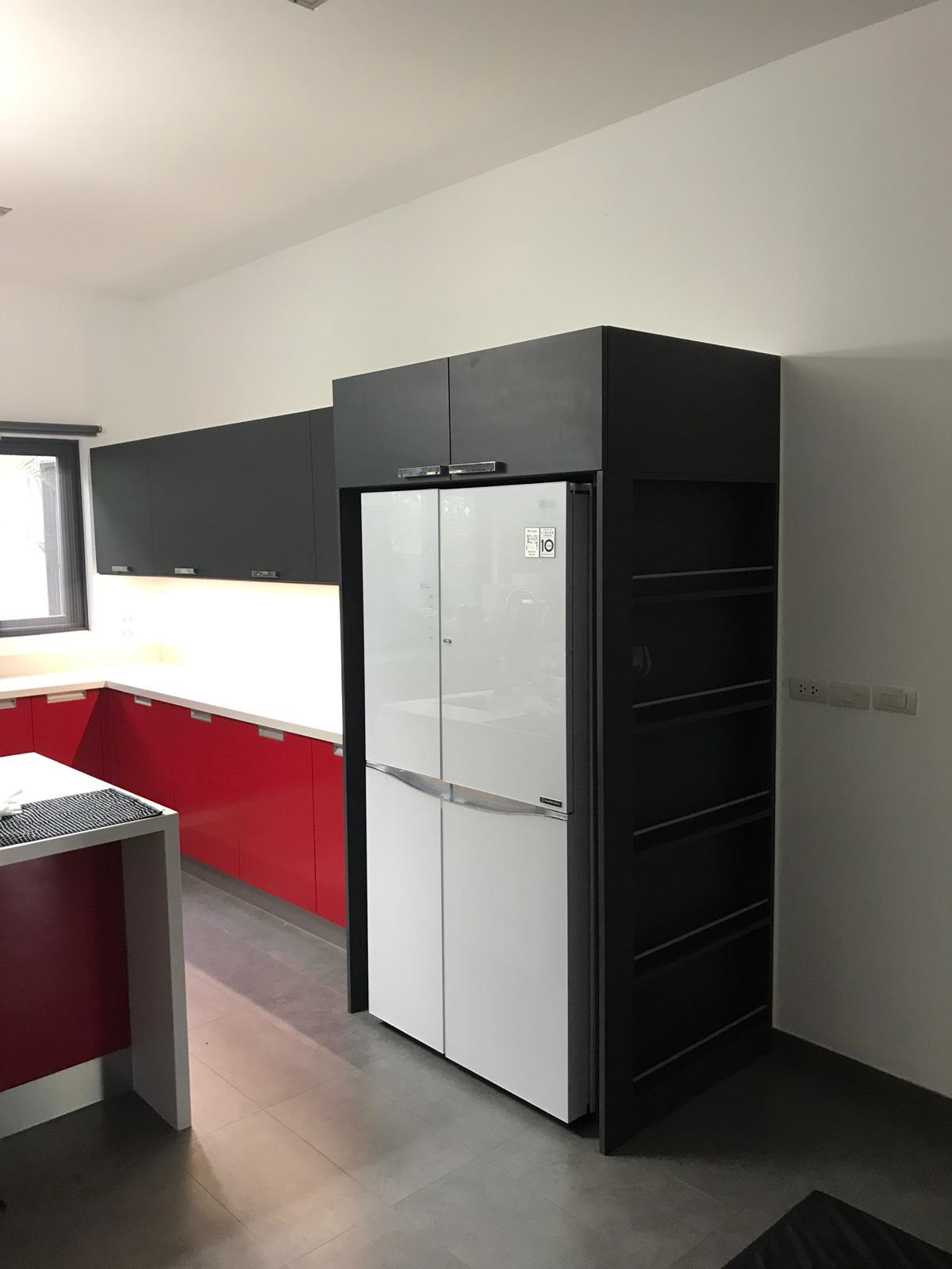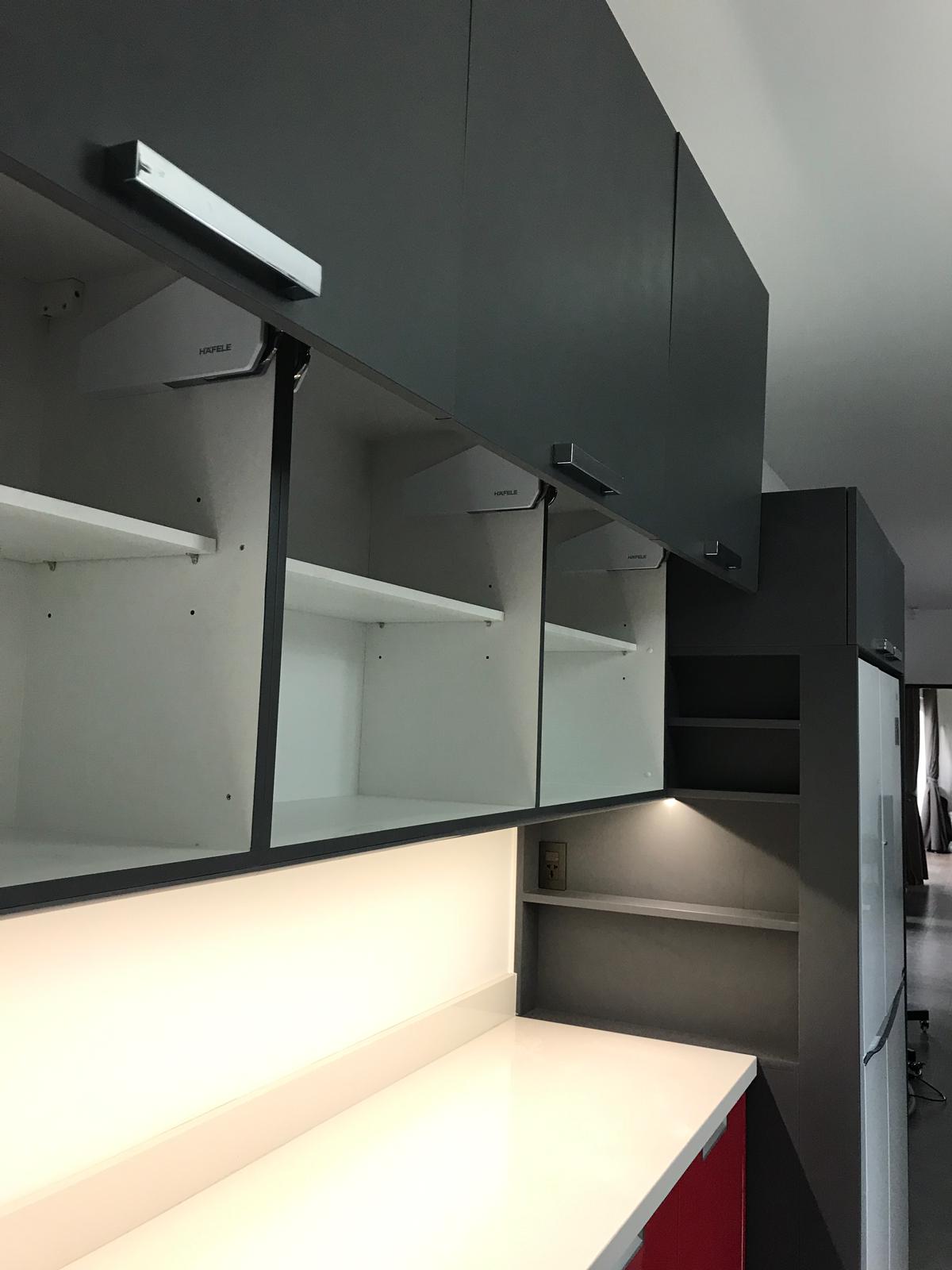 Kitchen hanging cabinet with fridge column, flap door with Hafele fitting and finishing in HPL laminate. Hafele handles imported from Germany. 155’000 THB
