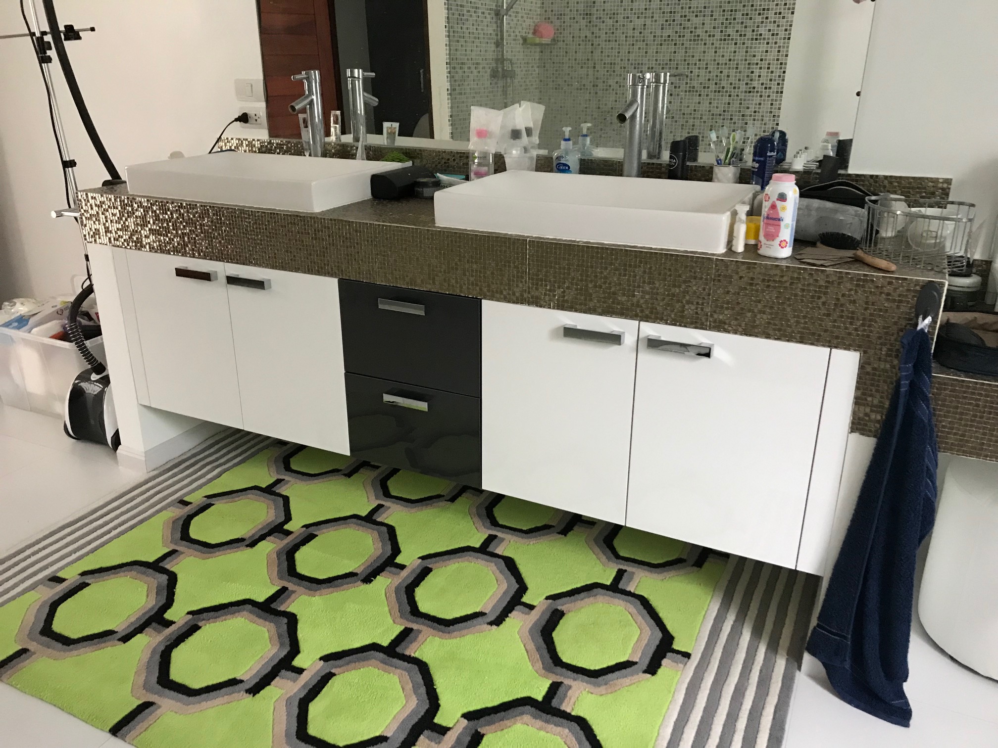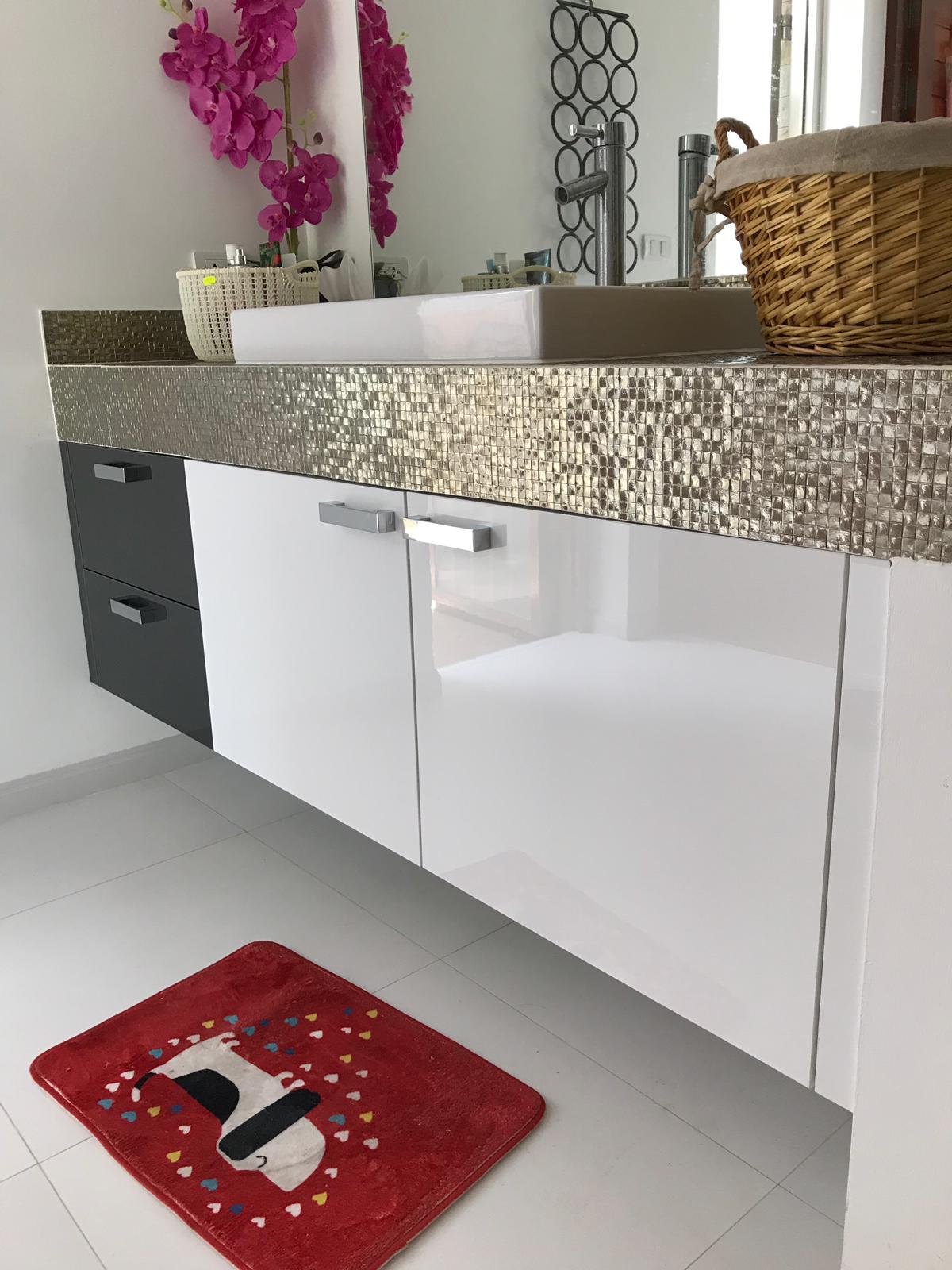 Bathroom cabinet: 3 Bathroom cabinet made by acrylic high gloss doors and drawers in white pearl and dark metal grey. 95’000 THB